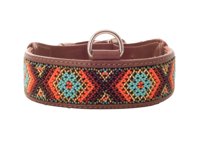 Materiales: Cuero genuino y chaquira de cristal. A diferencia de la tela o el nylon, las chaquiras nunca pierden su brillo y color. Eso es lo que hace que nuestros collares sean duraderos y únicos.